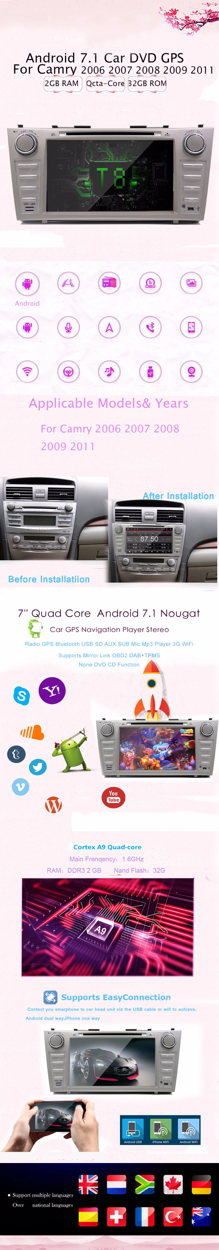 2G+32G android 7.1 car dvd navigation car dvd for Toyota camry 2008 2009 2010 2011 car stereo multimedia player *New Arrival: OS: Android 7.1 RAM: 2GB DDR3 Resolution: 1024*600 Screen: IPS Solution: Allwinner T8 Sound Processor *About Basic Functions: 1:Bluetooth for handfree. Bluetooth Phonebook Search From "A to Z" 2:HD Capacitive multitouch screen: 1024*600 3:Reverse camera/Drive Record DVR From Rear USB: Support 4:OBD, External MIC,Mirror Link : Support (need extra pay it) 5:Cold Start about 17-25 seconds 6:Mirror Link :Support 7:Steering wheel control:Support 8:Wifi:Built-in/Via phone as Wifi Hot Spot. 9:Support APPS: Many,for example :Google Play Store, Skype, Facebook, YouTube, Twitter etc 10:Support RDS.FM Frequency: 87.5-108MH AM frequency: 522-1710KHZ 11:Car Internet :built in wifi, suport 3G/4G/ Moderm (need extra pay it) 12:Support GPS Map,such as Google online MapYandex.navi/Waze on Line CityGuide. 13:Multi OSD Languaes: English/ Russian/ French/ German/ Spanish/ Italian/ Arabic/ Portuguese/Turkish/Thai/Polish/Hebrew etc 60 kinds language 14:Built in storage:Built-in 16G for system (32G option) 15: Boot Logo: Select The Built-in 50 Kinds Of Auto LOGO.Choose the car start logo as you like. 16:Rca cables for subwoofer 17: Easy to intall, Just plug directly 18: Pure Android 7.1 OS, Google Play Store, Skype, Facebook, YouTube, Twitter etc 1) Payment should be completed within 3 days or it will be cancelled by system automatically. 2) Please be assured your payment is safely kept by Aliexpress until confirmation of goods receipt. 3) In order to protect both buyers and sellers, Aliexpress need 8-24 hours to verify the payment. Then the order will be shipped within 3 working days (excluding weekends and holidays) once the payment is cleared 1) Please provide full name, correct post code and valid phone number to avoid any delay of delivery. 2) Singapore Post is good for most customers, and it is normally caused no customs tax, but it will take around 15-60 days arrive. 3) Remote region DHL/UPS/FedEX/TNT will be charged extra $30. Note: buyer make the payment for the price,just include the product price and the shipping costs. not include the tax (VAT,value add tax). the tax need to pay by buyer.Please check with your country’s customs office to determine what these additional costs will be prior to bidding/buying.We declare US$60 by default, We usually write the item name "car video system "and the Invoice value 40-60$. if you have special request then please leave a message when you make an order, then we will check and declare according to that. We will try our best to help our buyers to minimize the risk of paying the taxes. As our experience, 95% goods can reach needsometaxes, but we are NOT liable for ANY import taxes or customs delay. If the parcel return back to us due to the buyer refuse to pay the above fees, we would NOT resend the parcel until the buyer complete those fees and pay . If you choose DHL need pay taxes then please pay taxes. we will not responsible any taxes. If you disagree, please do not place the order. Please understanding. thanks ! Return and Warranty All products are brand new from the manufacturer, and has been tested strictly before shipping. Any quality issue please contact us within 3 days We will refund or replace the item. 1) Return within 7 days after receipt can be refund (exclude shipping freight) 2) Return within 20 days after receipt can be replaced. 3) Return within 1 year from the purchase date can be repaired. We have engaged in E-commerce market in Shenzhen for more than 6 years, winning great reputation and respect from our peers and customers since we constantly hold the conviction: Customer is God ,service comes first! only strive for 5 stars positive feedback and will try our best to offer the best service to our buyer. please do not hesitate to contact us by email or aliexpress message, and please give us 2 business days to resolve the complaint to your satisfaction.(No including Public holiday)Work Hours: Monday to Friday (09:00-18:00 GMT+8, US Pacific time 18:00-03:00 ) We leave positive feedback to every customers usually . To foster a healthy Ali community, we hope you will do the same to us 1) If you have any dissatisfaction, please give us the opportunity to resolve the problem before leaving us a negative feedback 2) We are sure that there is always solution and we don't want a bad feedback as an ending. 3) Best discount for kindly. Your satisfaction is always our